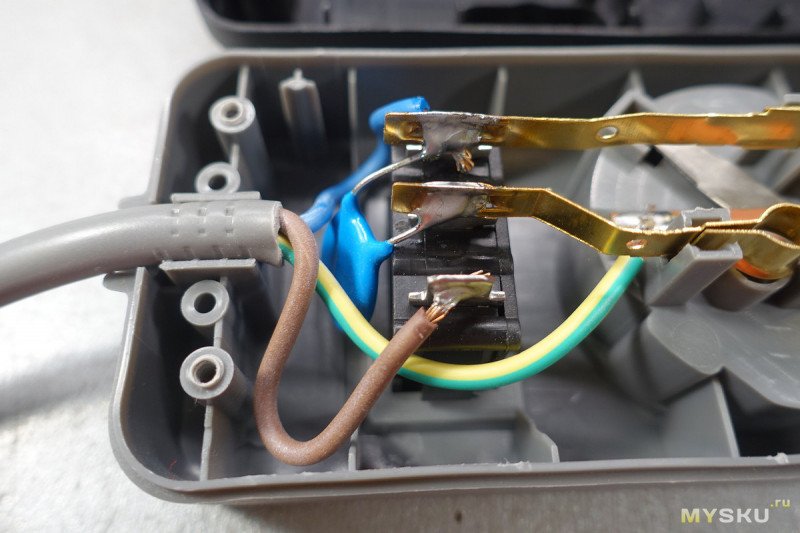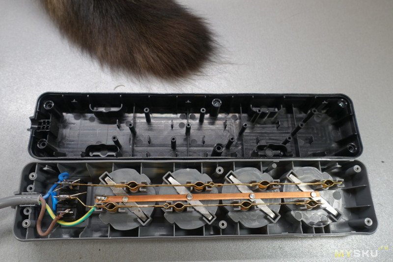 Так что, пожалуй, это идеальный представитель бюджетных сетевых фильтров/удлинителей. Он справляется с заявленной нагрузкой 10А (2300 Вт) без перегрева, его корпус изготовлен из негорючего пластика, контактные планки сделаны не из стали, провода имеют достаточное сечение, самое главное — благодаря термовыключателю, этот сетевой фильтр невозможно перегрузить — он просто отключается. Очевидные минусы — выключатель разрывает только одну линию (термовыключателей, разрывающих обе линии я не встречал), алюминиевые провода, слишком тонкие контактные планки.