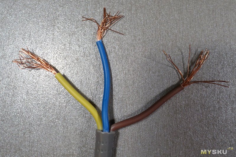 Провода с виду похожи на медные, но это алюминий с покрытием, делающим его похожим на медь. Синий и жёлто-зелёный провод содержит 16 жил диаметром 0.25 мм (сечение 0.79 мм²), в коричневом проводе почему-то 15 жил (сечение 0.74 мм²).