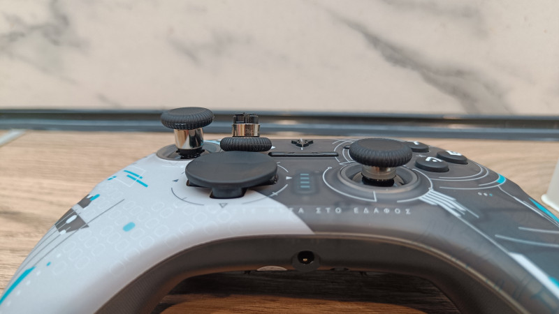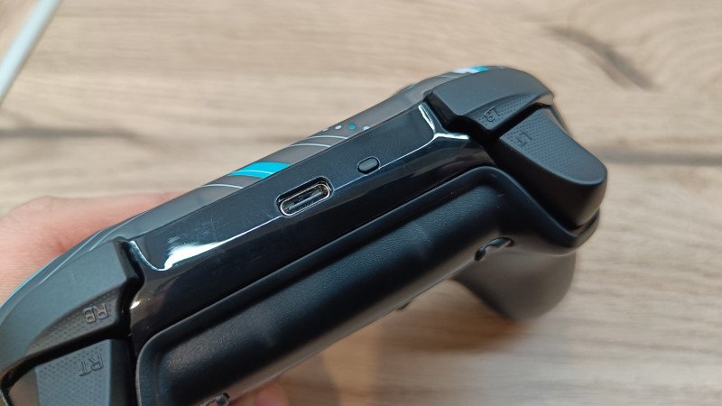 Верхняя часть также не обделена кнопками, хотя есть удобные выступы в случае игры без данных триггеров RB, LB, RT, LT. А еще есть разъем для подключения питания. Маленькая кнопка синхронизации.