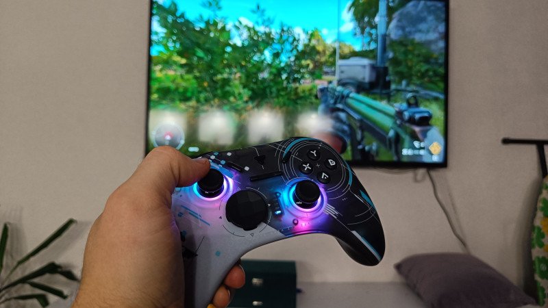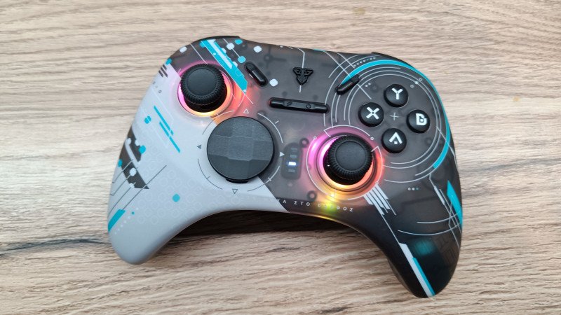 Геймпад выглядит очень привлекательно и в стандартной форме Xbox. Верхняя часть из полупрозрачного пластика, под ним размещается RGB подсветка, которую можно отключить для экономии заряда аккумулятора. Хват удобный. Покрытие матовое и устройство приятно держать в руках. Не скользит даже при продолжительном времени игры. Все кнопки под рукой, что очень удобно.