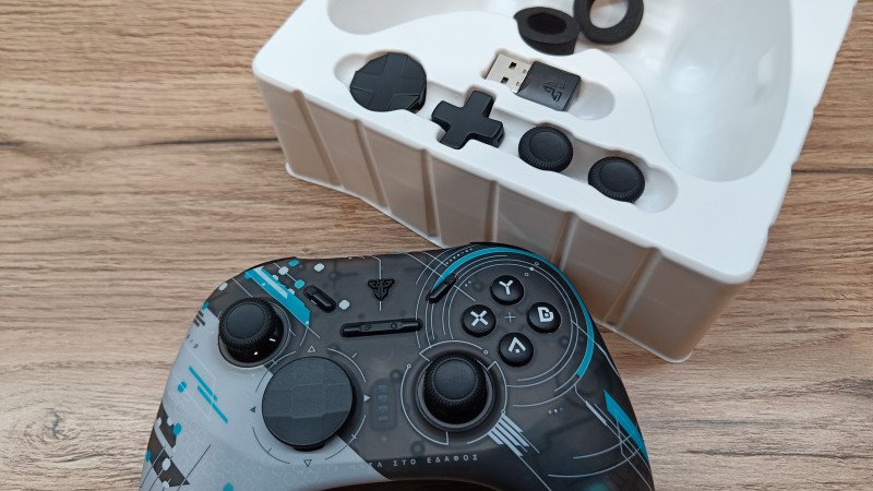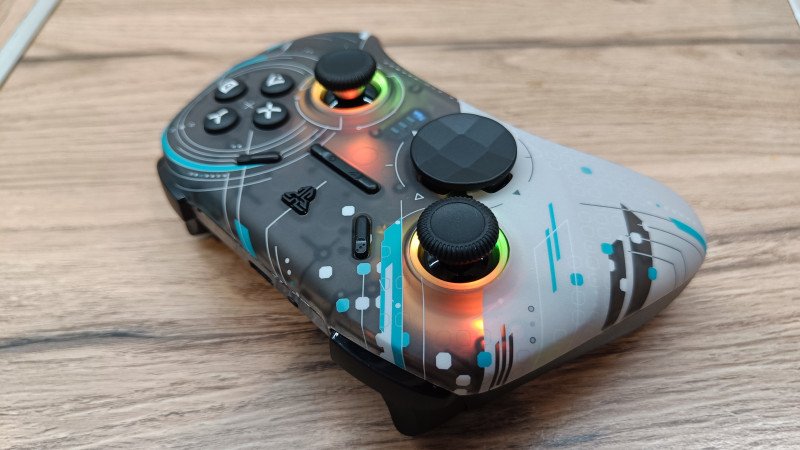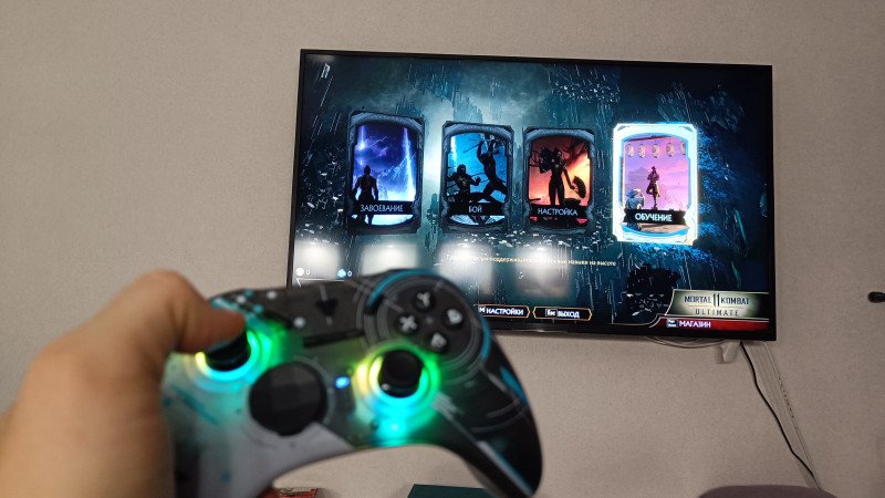 Неплохой вариант для игр. Простой в управлении с механическими переключателями и сменными стиками и D-pad накладками. Регулируемая вибрация, подсветка и некоторые другие режимы, которые по настоящему оценять любители игр. Несколько вариантов подключения, в том числе и по проводу или USB свистку. Индикация выбранного режима и многое другое.