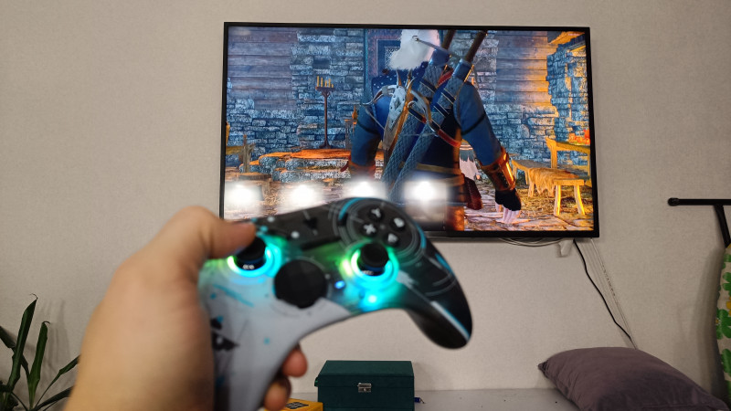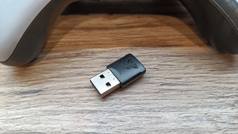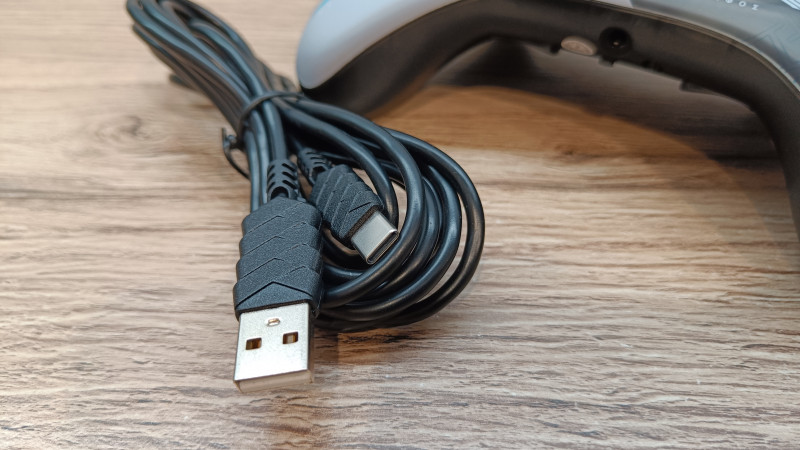 Провод с Type-C в пластиковой оболочке средней жесткости. Предпочел бы в тканевой и чуть длиннее. USB приемник/передатчик в виде маленькой флешки. При установке в компьютер драйвера не требуются. Подсветка передатчика зеленым цветом. Определяется на компьютере как XBOX 360 контроллер для Windows.