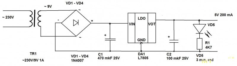Спаянная из заводского набора деталей плата (был под рукой) на L7805 (её маломощный вариант микросхема L78L05 с чуть иной чему 7805 схемой в корпусе ТО-92 по всем параметрам хуже L7805 и AMS1117 или LM317) уже давно в корпусе работает, но стоящие там входной конденсатор на 470 х 25В и радиатор-флажок ограничивают её выходной ток значением 150 мА при входном напряжении 9В, хотя данная плат без значительного нагрева при +20 в комнате отдаст до 300 мА, но не более. А если температура выше ёе выходной ток придётся снижать до расчётного иначе сработает схема теплозащиты и микросхема выключится по перегреву.