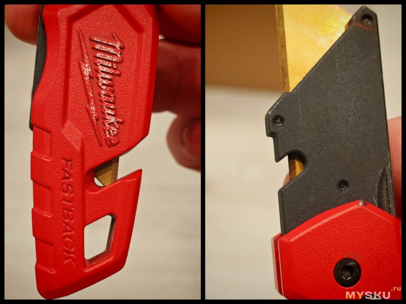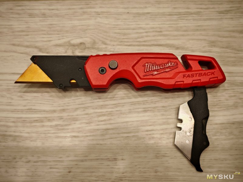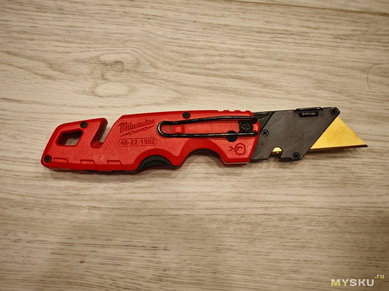 Брал для работы на складе — вскрытия мешков и коробок, и для нарезки кварцвинила дома. За счёт выемок под пальцы в руке держится хорошо, что голой рукой, что в перчатках. Крепкий, полностью из металла, держит любую нагрузку, которую выдержат лезвия. Сделан под правую руку. Скоба для пояса тугая. За несколько месяцев лежания в кармане вместе с фонарём и ключами (в том числе летом) только белая краска надписи сошла.