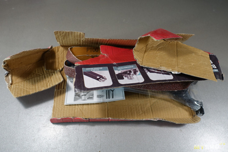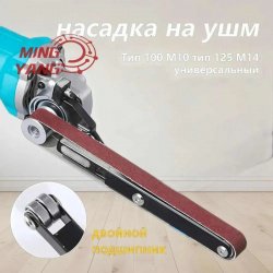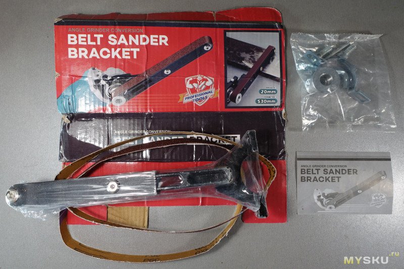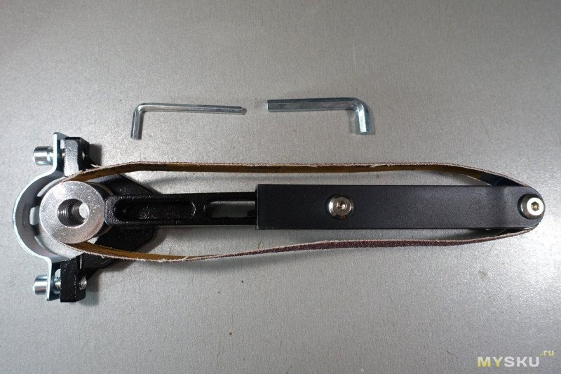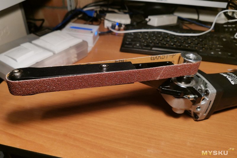 Этот «гриндер на минималках» представляет собой насадку на УШМ, ширина абразивной ленты 2 см, длина ленты 52 см, соответственно длина рабочей части около 25 см.