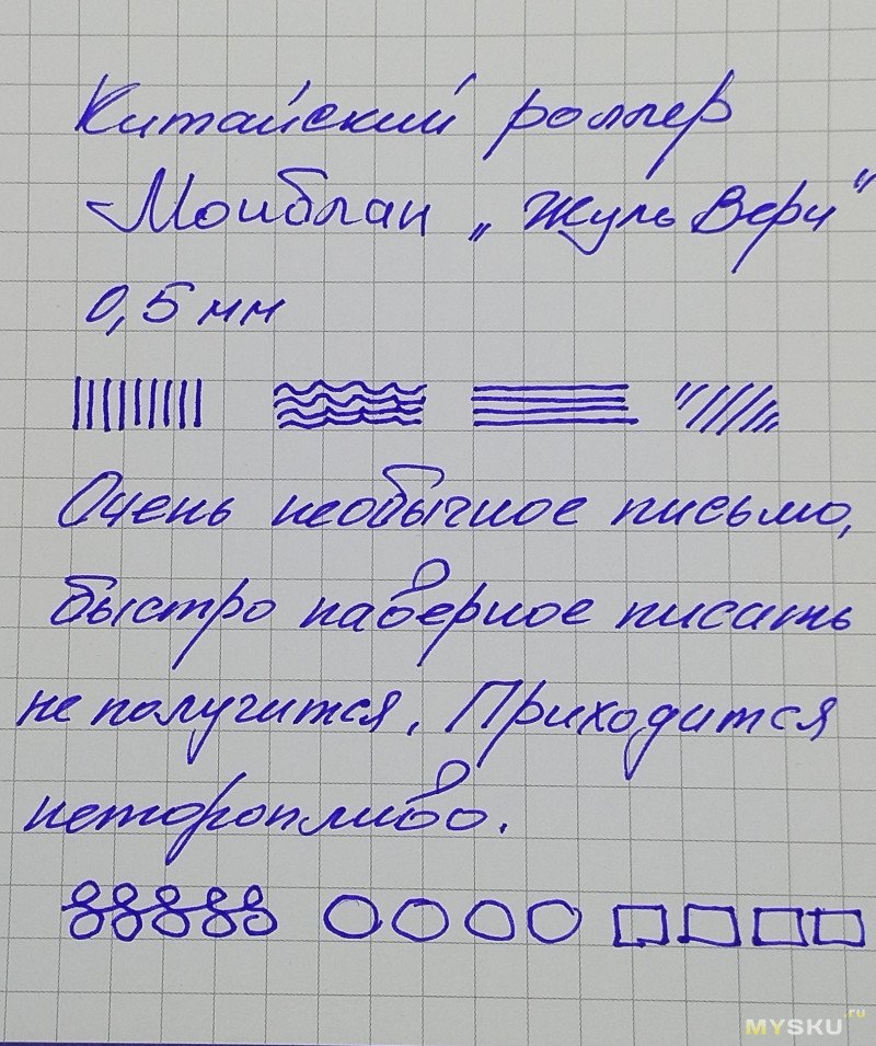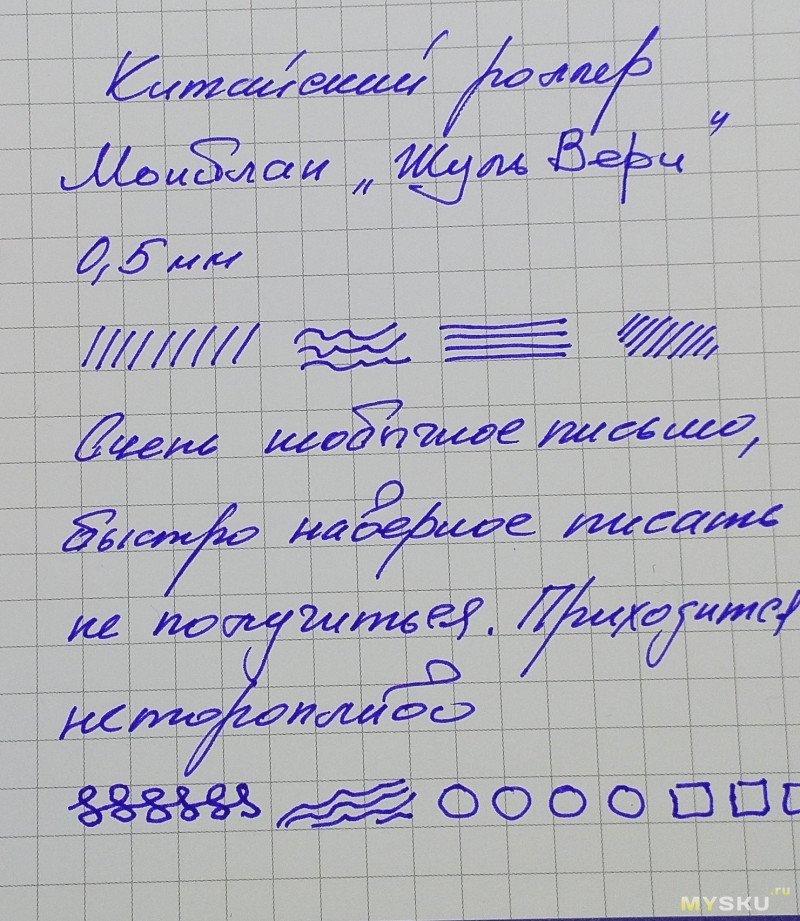 А вот само письмо. Под углом 45 градусов от оси ручки к плоскости бумаге и больше ручка пишет отлично. Если угол уменьшается, то писать становится некомфортно — есть пропуски. Тоже самое, если стараться писать быстро — возможно пропуски. Если же писать, не торопясь — все отлично. Т.е. если достать ручку, открутить массивный колпачок, и не торопясь поставить подпись на документах — все отлично и достойно.