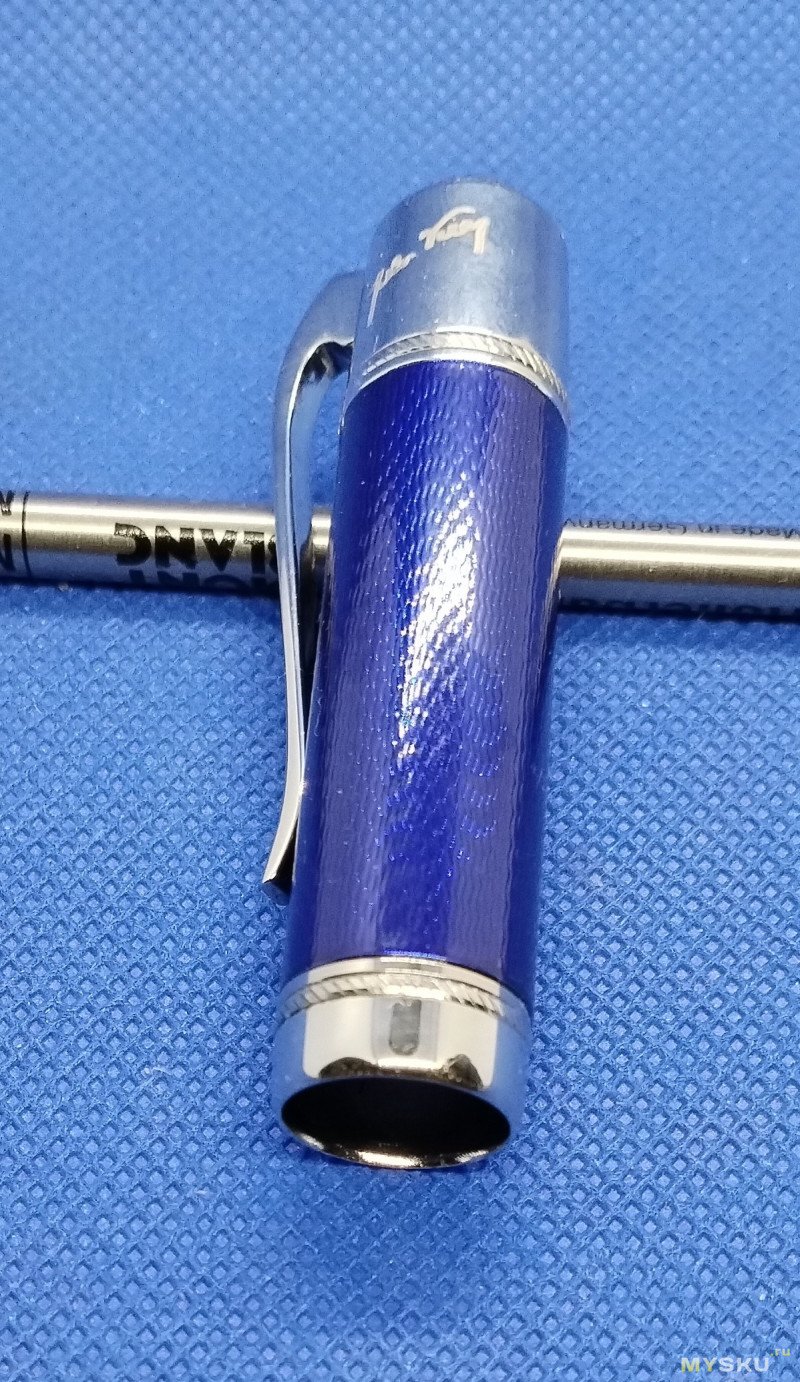Отделка: Все металлические детали (клип, кольца) выполнены из позолоты 750 пробы, что создает контраст с синим корпусом.