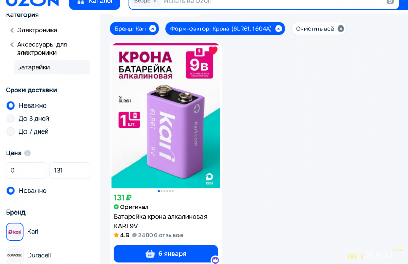1) KARI 9V (6LR61) — 96 руб. Озон, арт.1636758893.