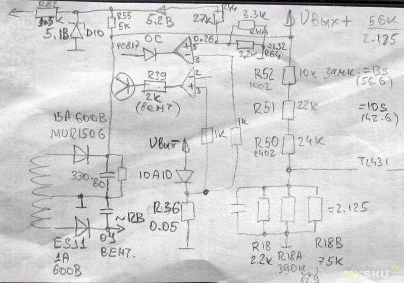 Делитель обратной связи по напряжению состоит из 3 резисторов последовательно — R50=10k, R52a=22k, R52=24k, в сумме 56k и 3 параллельно в нижнем (R18=2.2k, R18A=75k, R18B=390k), итого 2.125k. Причем они набраны частично выводные, частично smd.
