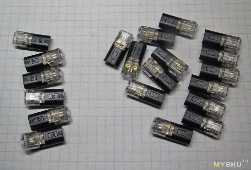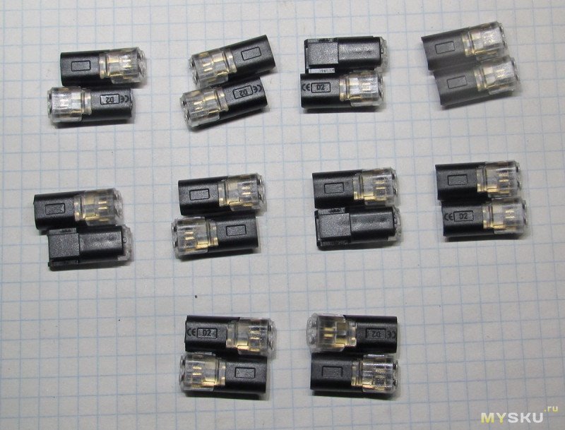 В наборе 10 пар двухконтактных соединителей. Они симметричны и совершенно одинаковы. Правда одни с маркировкой, другие без