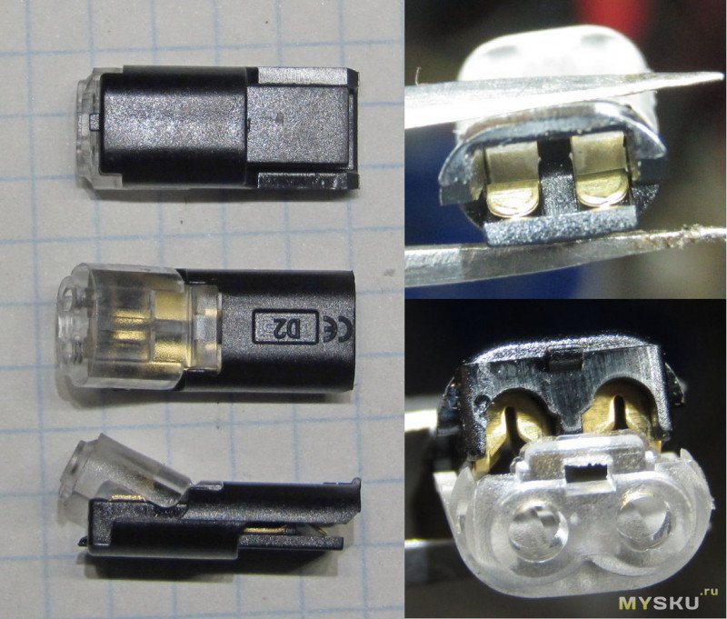 Вообще, я довольно прохладно отношусь к соединителям, которые присоединяются к проводу протыканием изоляции. Там есть нюансы в плане допустимых сечений, и шаг влево-вправо — и ты или не контачишь толком, или перерезал половину жил. Но давайте посмотрим что же нам предложат в данном лоте.