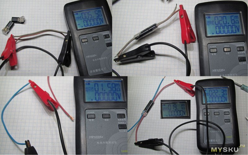 Как видим, общее сопротивление (провод-контакт)+(контакт-контакт)+(контакт-провод) составило 15-20 мОм в зависимости непонятно от чего. Возможно что-то пошло не так при измерении сопротивления куска колоночного кабеля
