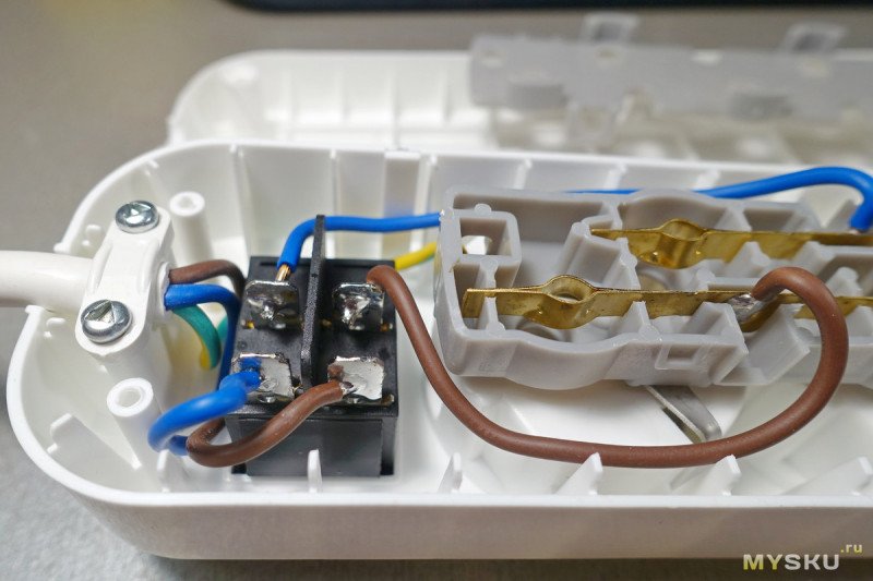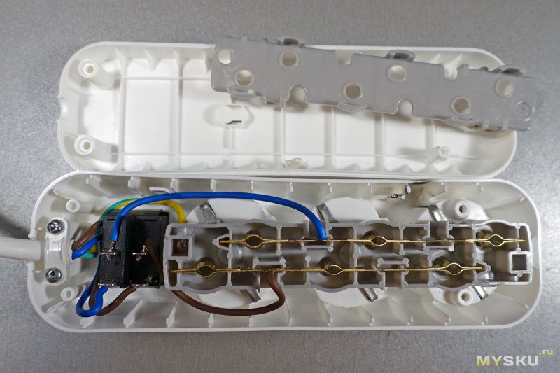 Замечу, что это далеко не худший представитель класса бюджетных удлинителей. Если считать, что он рассчитан на ток 6 А (1380 Вт), всё остальное у него совсем неплохо: негорючий корпус, выключатель разрывает обе линии, контактные планки сделаны не из стали, есть внутренний защитный кожух, присутствует настоящее заземление (я уже встречал «удлинители с заземлением», у которых физически не было третьего провода несмотря на наличие вилки и розеток с заземлением).