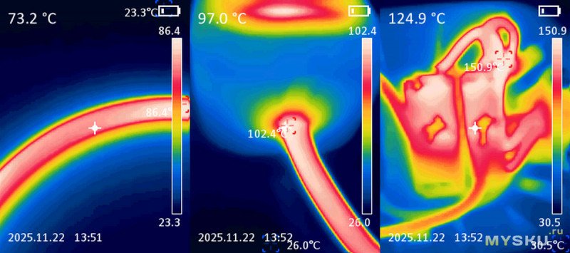 Внешняя оболочка провода нагрелась до 86°, провод у входа в корпус до 102°, выключатель до 151°. Появился запах перегретого пластика. Существенный нагрев вилки и контактов блока розеток не зафиксирован.