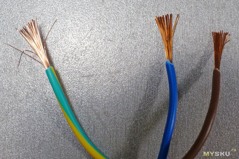 Провода с виду похожи на медные, но это неизвестный сплав с покрытием, делающим его похожим на медь. Провода состоят из 30 жил, диаметром 0.2 мм (общее сечение: 0.95 мм²).