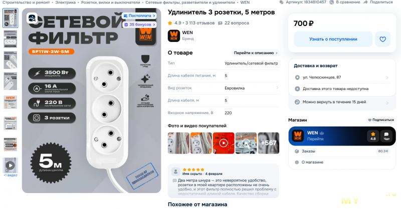 трехпяти метровый удлинитель, рублей около… 400 с копейками вроде, с озона.Вчерась понадобилась тройная розетка с метровым концом. Думаю, обрежу… лишний провод пригодится.