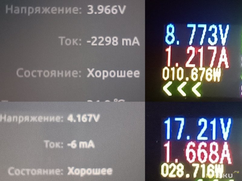 В колаже: сверху напряжение и ток в батарее (пpограммой в телефоне), они же на входе (тестером kws1902c), зарядное 30Вт; ниже тоже при зарядном на 60Вт, ток 6А (читать).