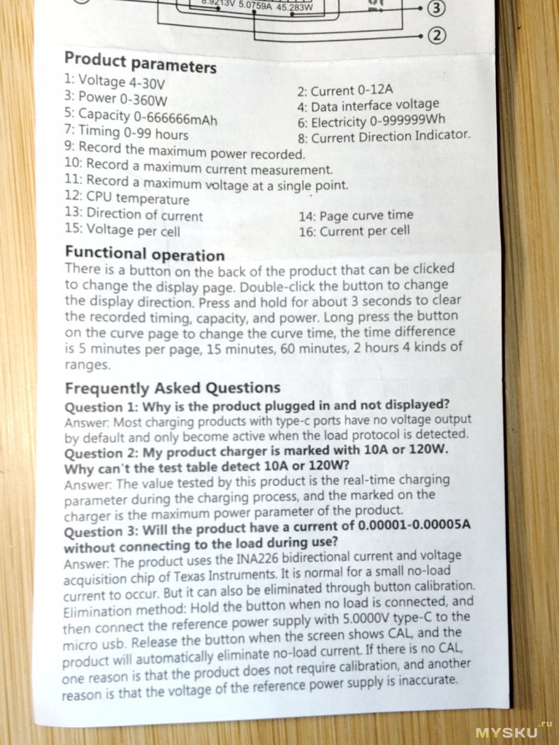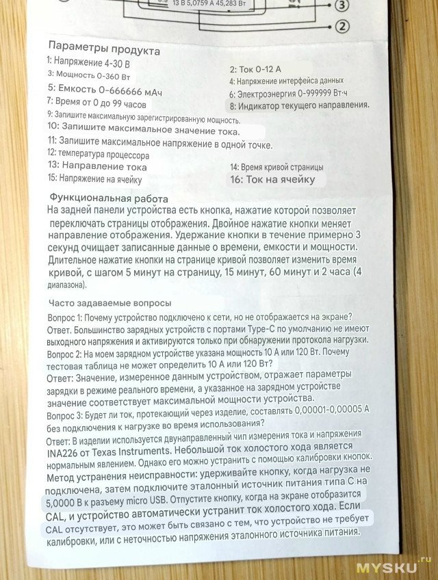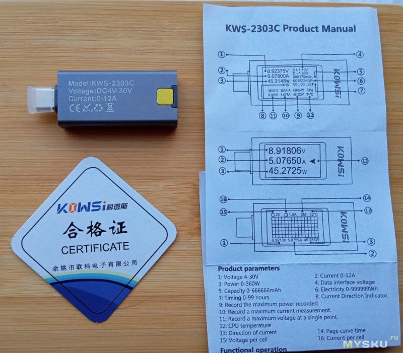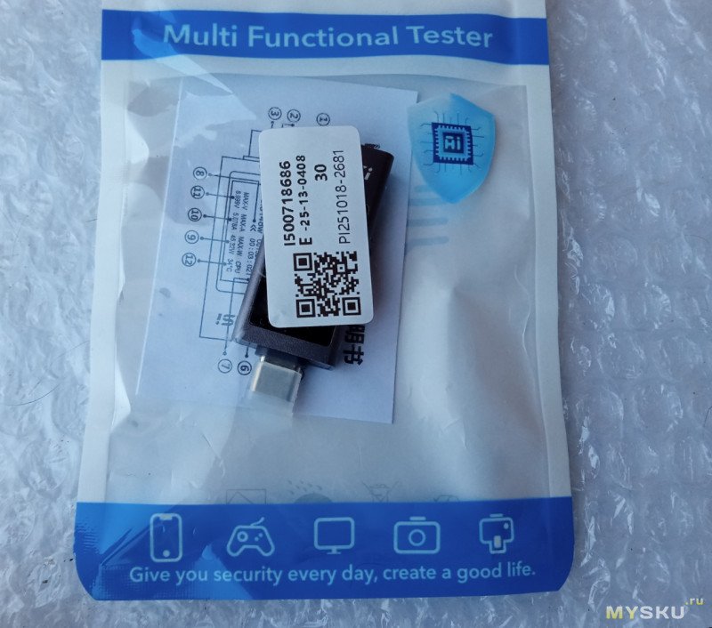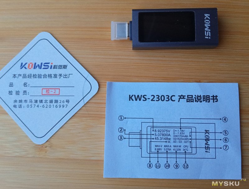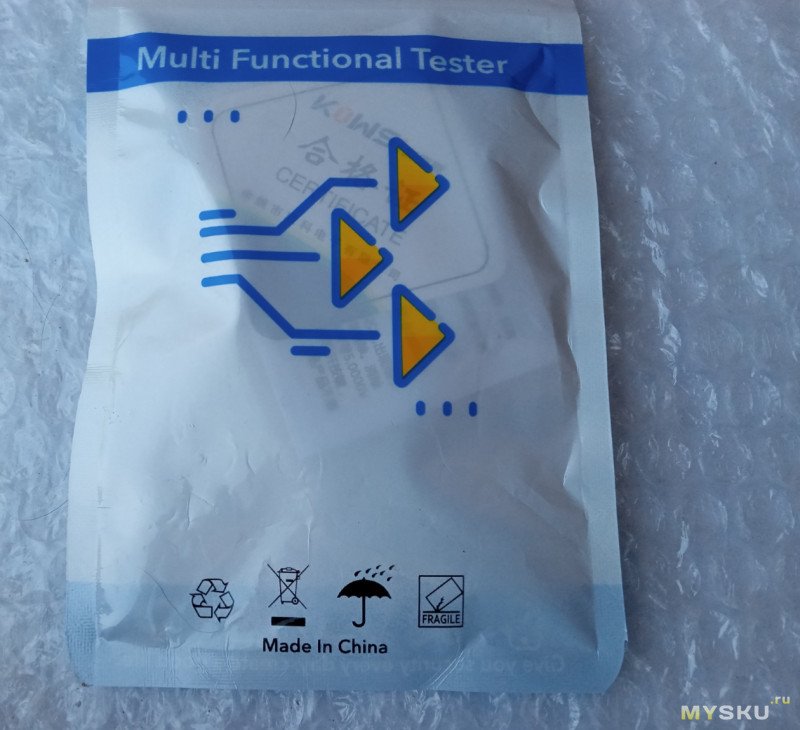 В комплекте: тестер, колпачок на разъём, инструкция и «сертификат» некий: