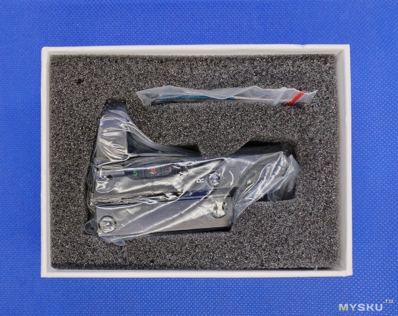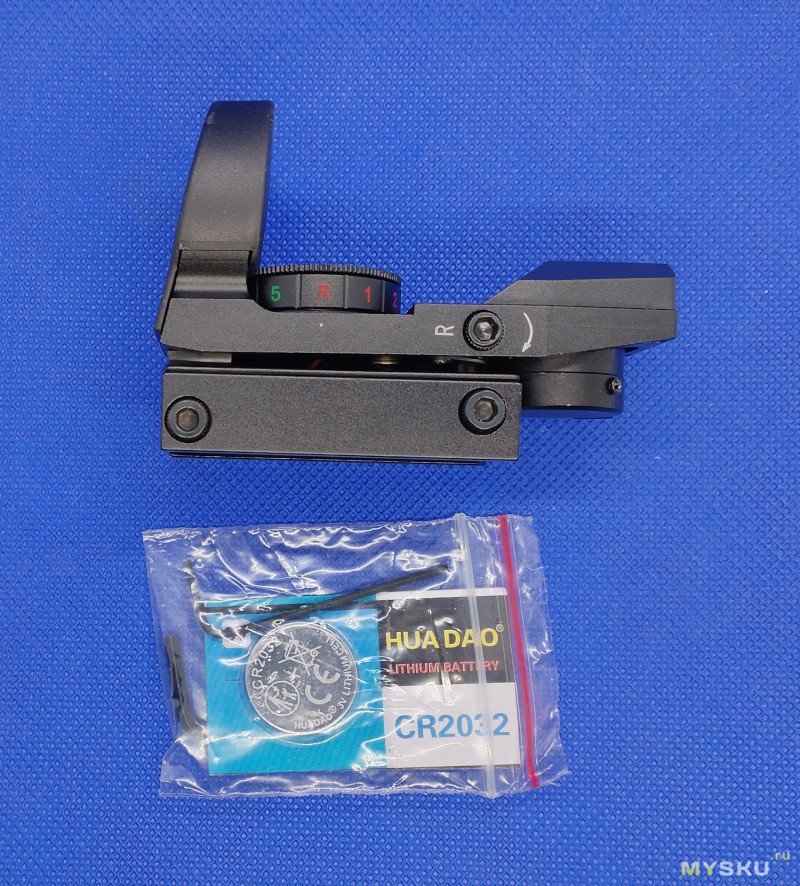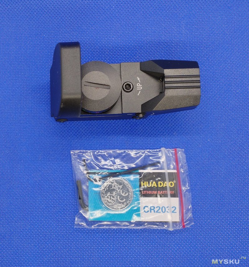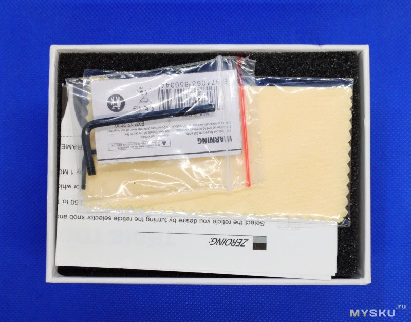 В ней находится непосредственно сам прицел, защитная крышка, запасная батарейка (одна уже установлена в прицел), два торцевых настроечных ключа, инструкция на английском.