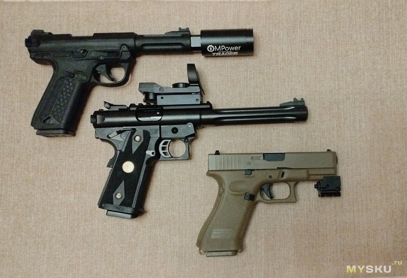 Сверху вниз AAP-01 с трассерной насадкой, GALAXY Hi-Capa c коллиматором, Глок-19Х с ЛЦУ