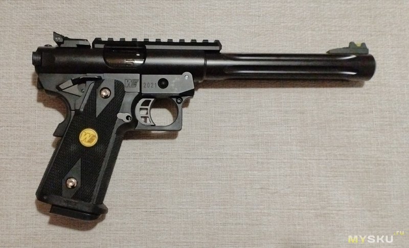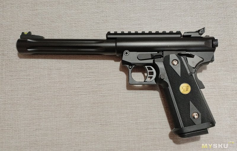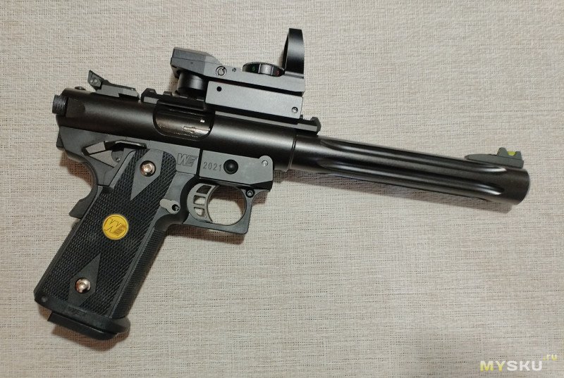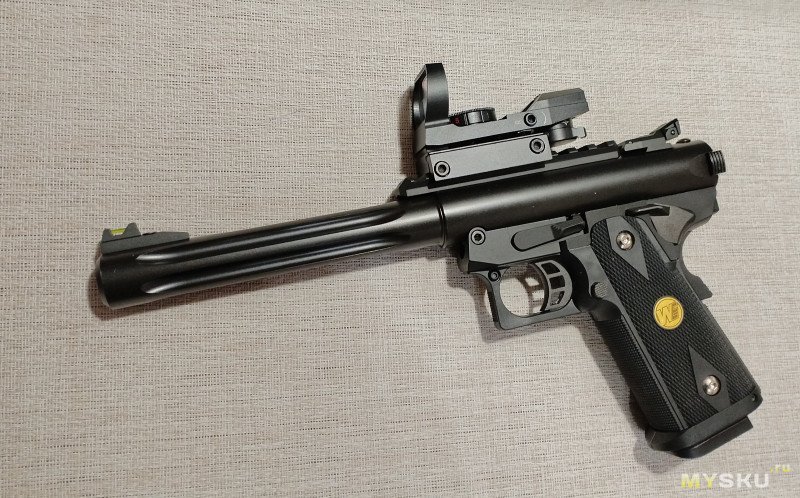 Вместе с прицелом пистолет выглядит если не монструозно, то достаточно солидно. Конечно масса выросла — 1250 грамм.
