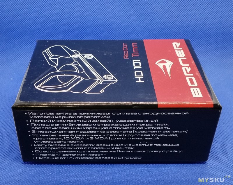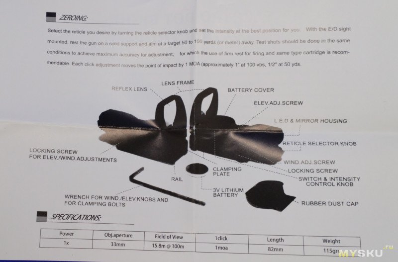Кратность увеличения — 1Х. Диаметр объектива составляет 33ммИнструкция на данном прицеле на английском языке, а у варианта с брендом Borner — на русском.