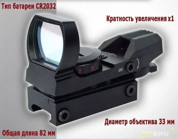 Питание: литиевая батарея CR2032. Диаметр объектива: 33 мм. Размеры прицела: 8,2 × 5 × 5,5 см.