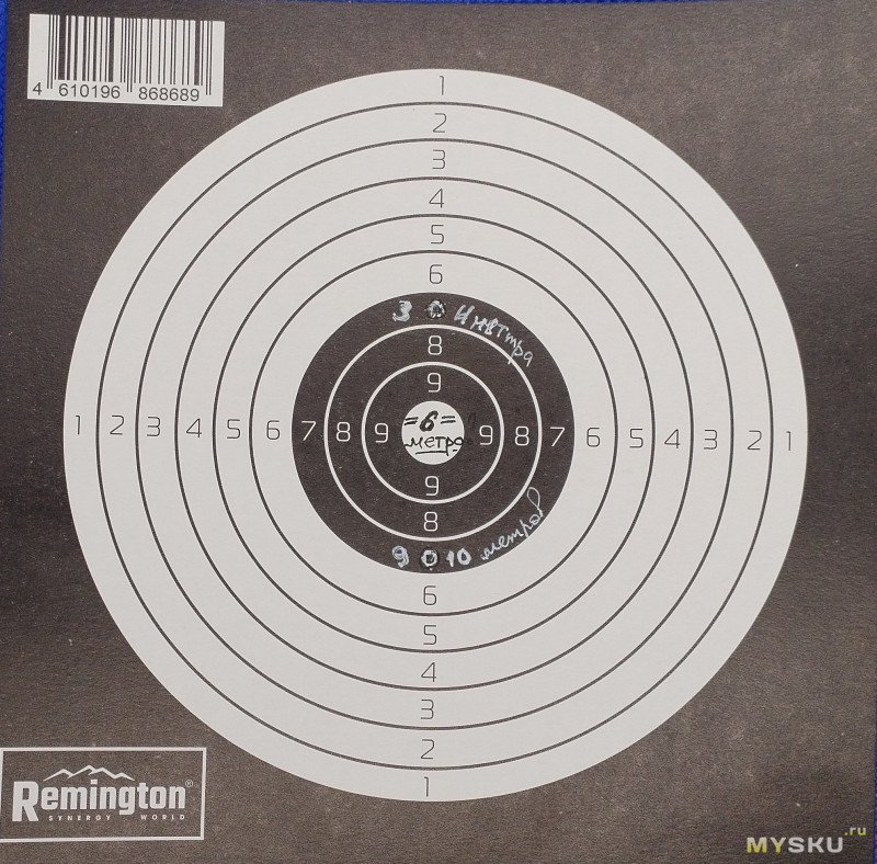 Для примера: пистолет пристрелял красной точкой на 6 метров. Именно точкой, т.к. остальные маркера просто не подходили для комфортной работы, и именно красной. На мишени это белая «10». Чтобы попасть в эту «10» на 3-4 метрах точку прицеливания нужно сместить вверх на 20мм вверх по вертикали. А чтобы попасть в «10» на 9-10 метрах точку прицеливанию смещаем вниз на 20мм.