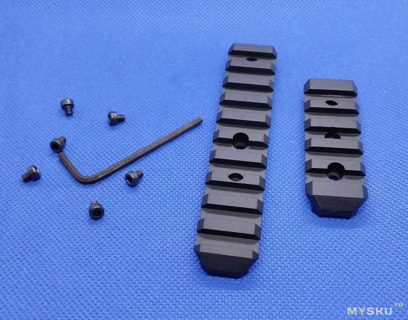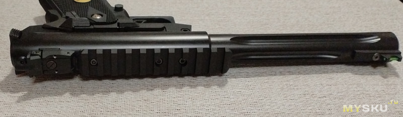 Одна длинная, именно для данного пистолета. И короткая, но для другого исполнения модели с монтажом под кожух ствола. На моем GALAXY HI-CAPA ее установить нельзя. Что собственно меня не огорчает, можно осуществить монтаж на любое другое устройство, крепеж имеется.Планка без проблем была установлена. Крепление винтами в трех точках к корпусу ствольной коробки. Люфтов нет, все четко, жестко, надежно.