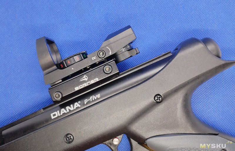 Логично, что если есть планка, то на нее можно что-то поставить. Ничего кроме коллиматора я бы не хотел использовать для данного пистолета. А он в свою очередь должен быть простой, недорогой и достаточно эффективный для своей цены. Выбор пал на самый массовый и бюджетный прицел. Выпускается он под разными названиями и в том числе под брендом Borner. Прицел произведен в Китае. Стоимость его на просторах Озона от 1400 до 2500 руб.