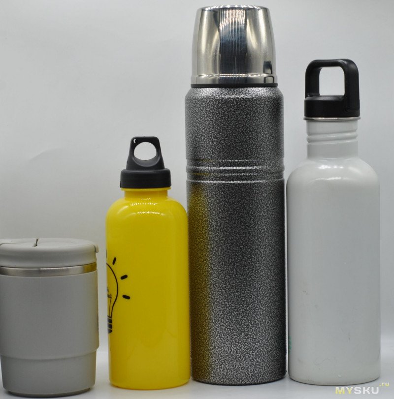 Слева 0,5 литра кружка, 0,6 л желтая бутылка и справа литровая металлическая бутылка.Эксплуатация