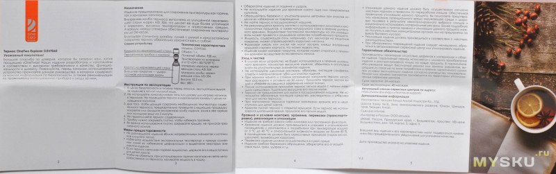 Внутри термос с тканевым чехлом и руководство пользователя на русском.