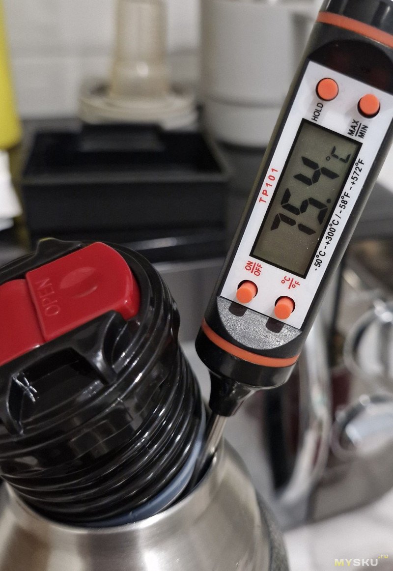 Производитель дает данные 59 градусов через сутки, у меня вышло 60. Если открывать пробку реже данные были бы чуть лучше. И для лучшего сохранения температуры перед использованием необходимо нагреть или остудить колбу термоса в течение нескольких минут.