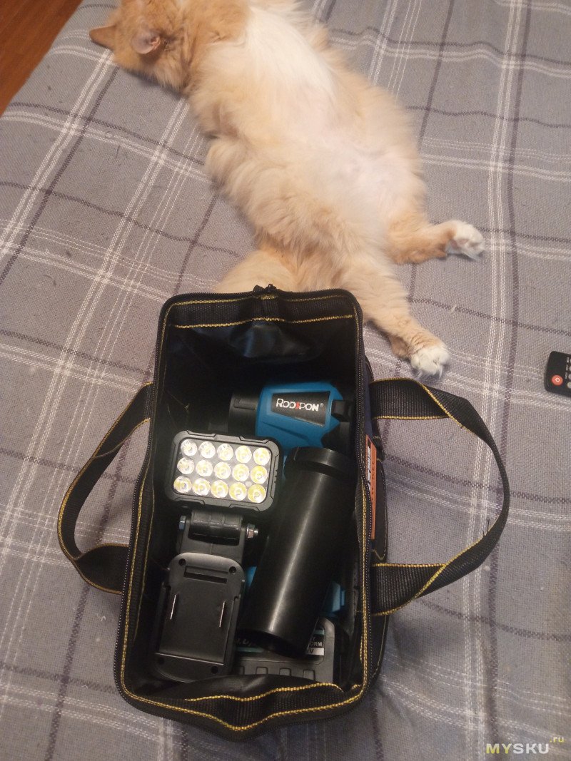 Понапокупал инструмента аккумуляторного без ничего, а хранить в картоне западло. Решил присмотреть сумки для хранения и транспортировки. Для начала приобрёл данную модель. Первое впечатление вполне положительное. Основной материал — очень крепкая синтетическая ткань. Основной цвет — синий. Внутри вставка из водонепроницаемой клеёнки — удобно мыть при загрязнении. Для рыбаков можно носить живца. Единственный неочевидный недостаток — один замок в молнии. Обычно в таких устройствах два встречных. На странице продавца очень много отзывов, в основном, толковых и положительных. Поэтому забивать дерьмом и фотографировать не стал. Только фото девайса, для которого покупал. Как видно, на одной стороне 3 кармашка с клапанами для мелочей. С другой — 2 без клапанов. Типа инструкции, деньги бумажные можно положить. Внутри никаких карманов нет.