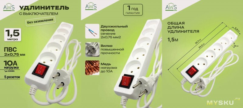 Удлинитель на 5 розеток без заземления с выключателем AWS-H05K-1.5