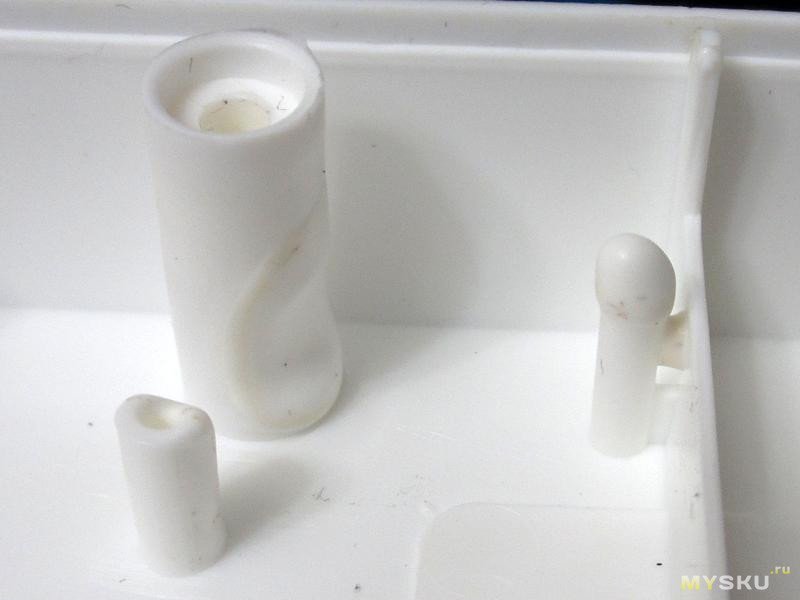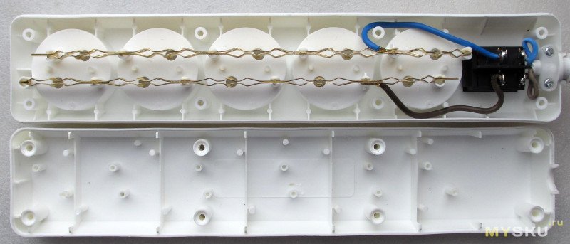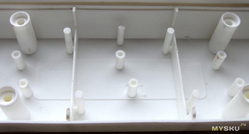 С обратной стороны корпуса есть три набора подпорок, плоские перегородки и штырьки с отверстием для токоведущих шин и тонкие для шины земли (которой здесь нет), видимо универсальный вариант.