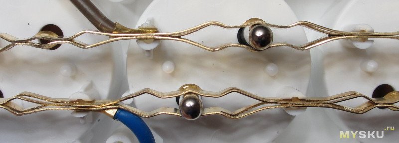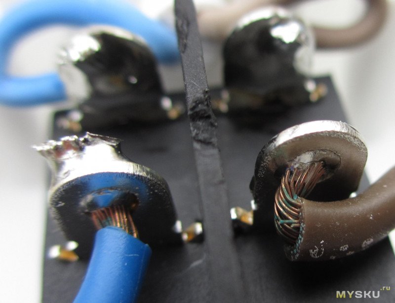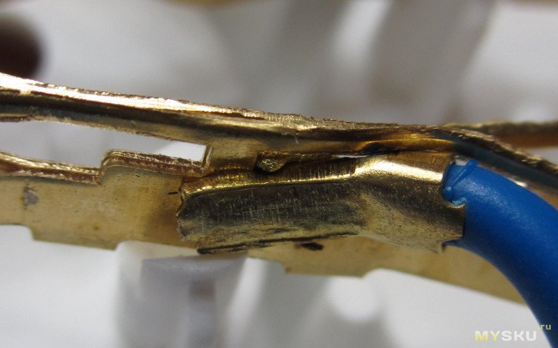 К выключателю провода припаяны, к шинам — обжаты и приварены. Что забавно, приварены ровно в том месте, где шина проходит через упоры, причем они тут специально расширенные. Один из проводов в месте пайки слегка позеленел, видимо флюс излишне активный.
