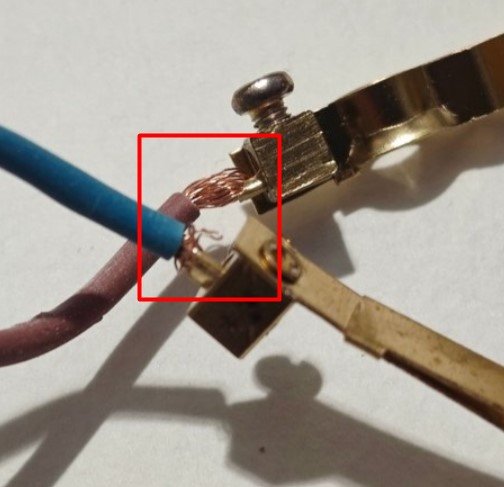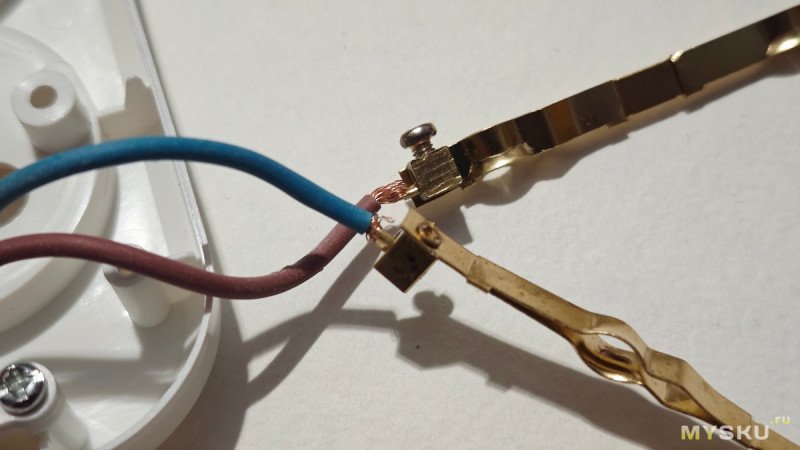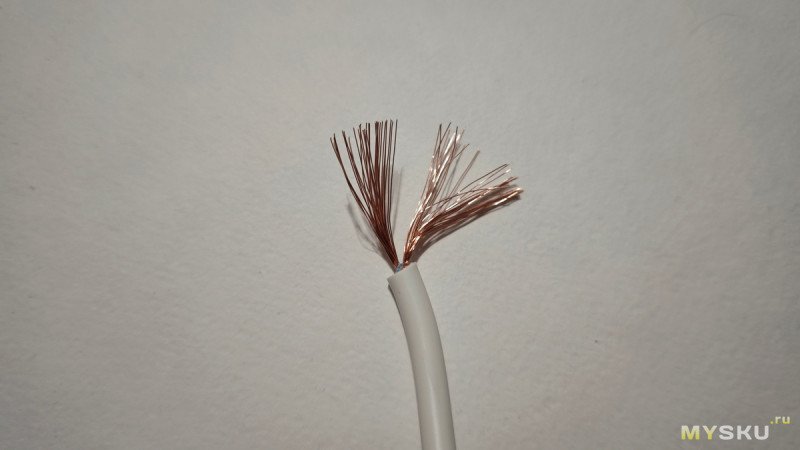 Провода с виду похожи на медные, но это алюминиевый сплав с покрытием, делающим его похожим на медь. Количество жил в проводах оказалось разным: коричневый — 33 жилы диаметром 0.2 мм (сечение 1.04 мм²), синий — 32 жилы диаметром 0.2 мм (сечение 1.0 мм²).
