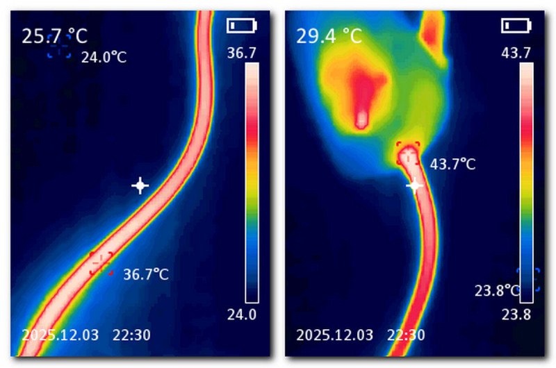 Температура внешней оболочки проводов составляет 37°C, у точки входа корпус 44°. Существенный нагрев вилки и контактов блока розеток не зафиксирован.
