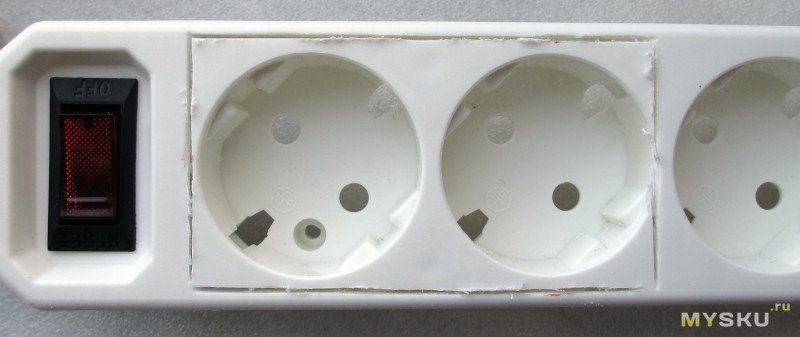 На розетках стоят шторки (в предыдущем экземпляре такого не было), их корпуса отделяют земляную шину от силовых.