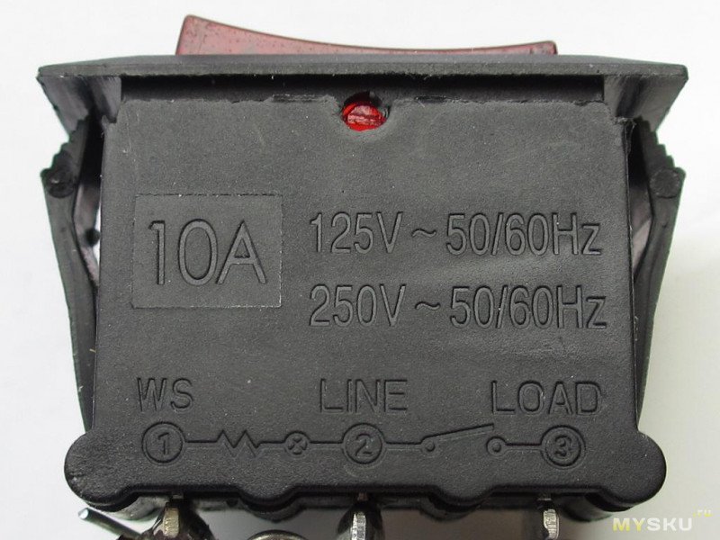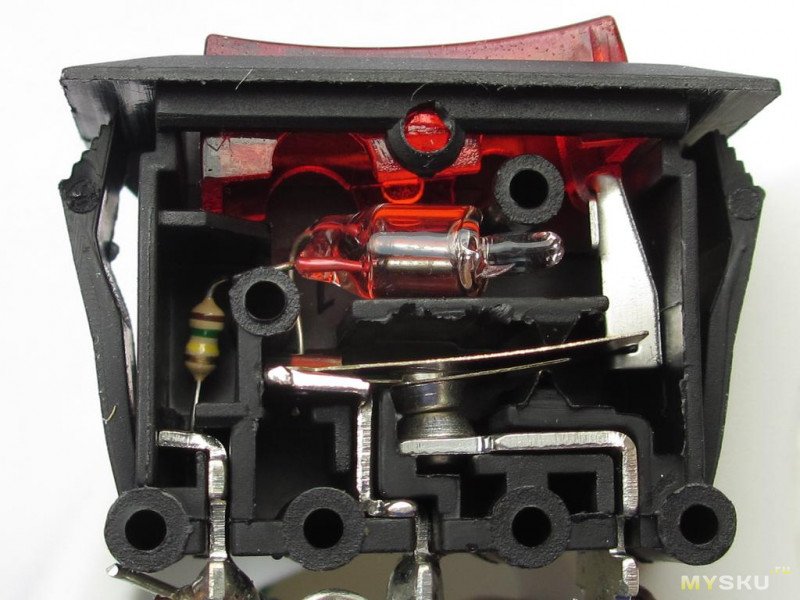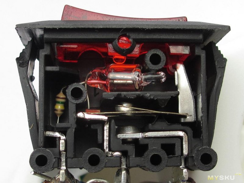 Выключатель однопроводный, с подсветкой и термопредохранителем.Сопротивление каждой жилы кабеля 80мОм при полной длине ~130см (включая то, что внутри колодки). От ввода до дальнего конца шины 12-13мОм, из которых половина — выключатель.