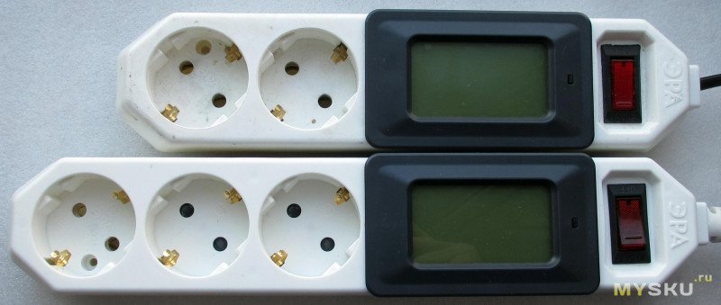 Похоже у старого подсветка начала уставать, на снимке не так заметно, а вживую бросается в глаза. Сами P06S-20 покупались с разницей в несколько лет и видимо разных ревизий, несколько отличается поведение при включении.Основное достоинство — совместимость размеров с установленным ваттметром. Кабель сомнительный, хотя 10А худо-бедно выдерживает. Колодка — ничего страшного не отметил, только опять же кабель зажат плохо и крепления оказались сорваны. Еще и цену задрали.