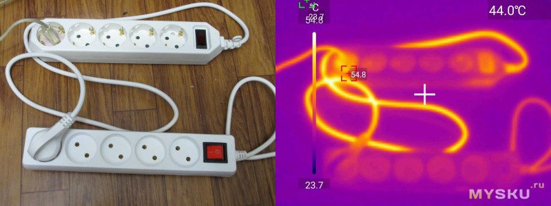Выключатель при 10А — 46C, шины около 40C, вилка — греется выходящий из нее провод, провод — около 60C, выключатель без нагрузки, только от неонки — 38С: