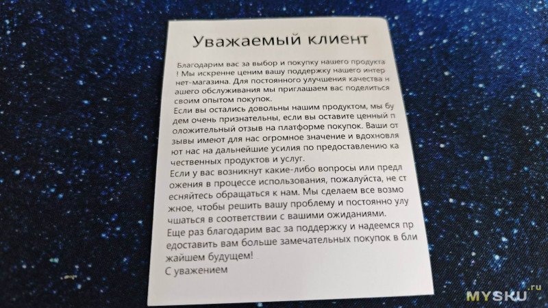 Внутри сама перчатка и какая-то открытка. На её обратной стороне продавец благодарит нас за покупку и просит оставить отзыв на товар.