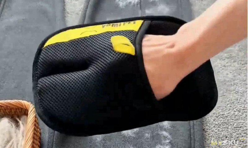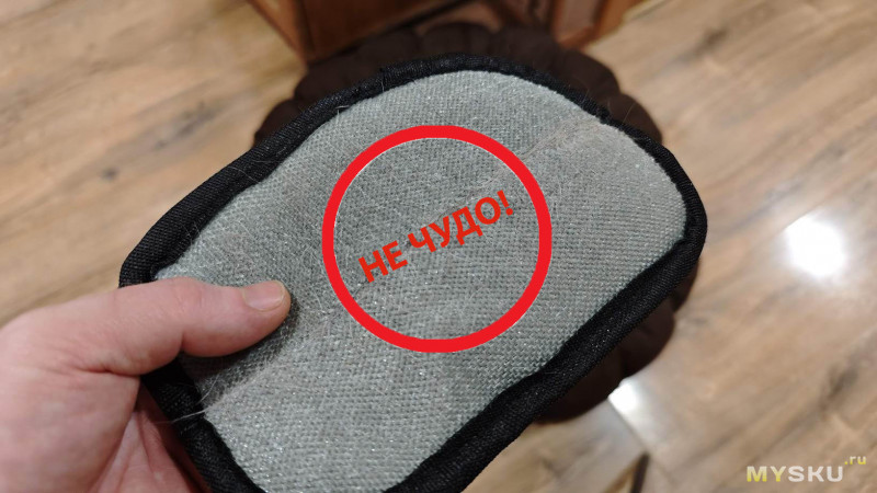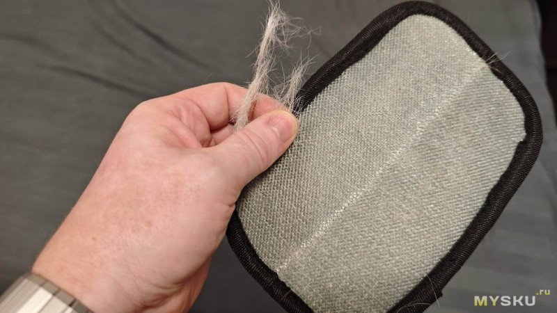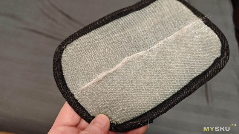 Причём перчатка поделена ровно посередине на две части, щетинки которых направлены чётко навстречу. В этом и заключается секрет тряпки. Щетинки гоняют шерсть друг к другу, скатывая её в косичку по центру перчатки.