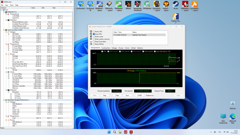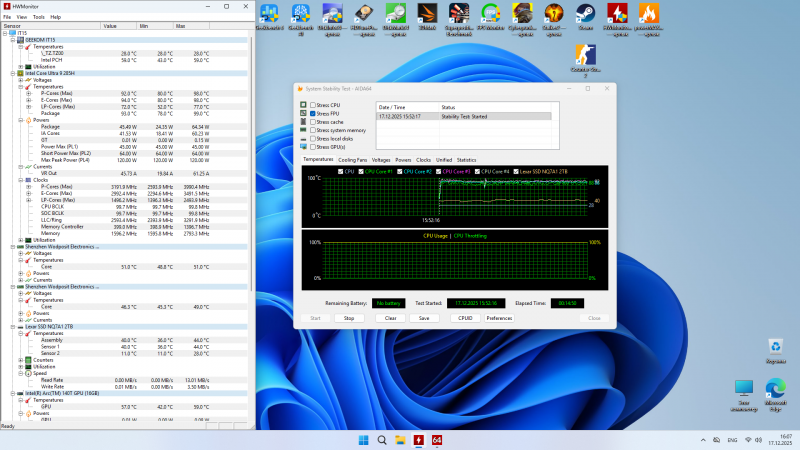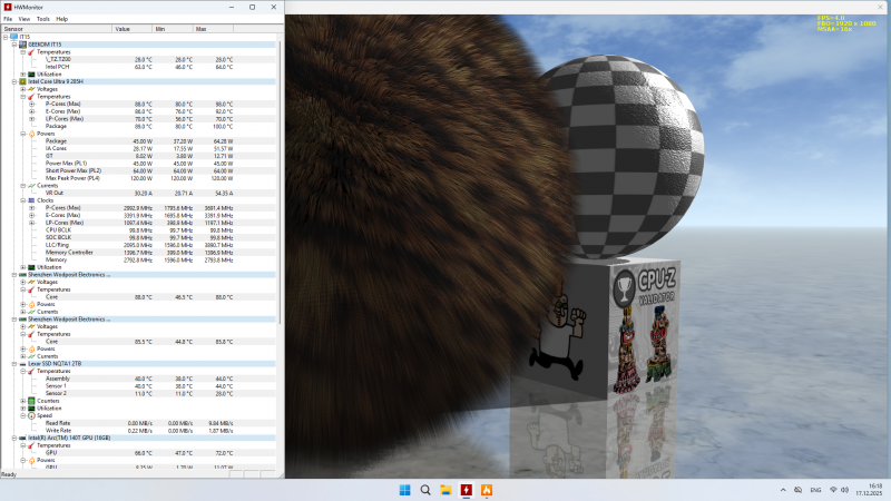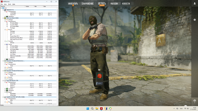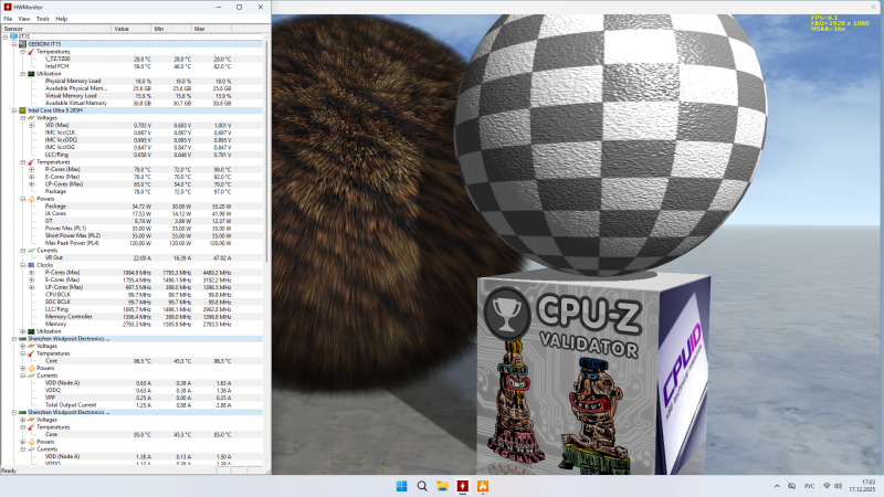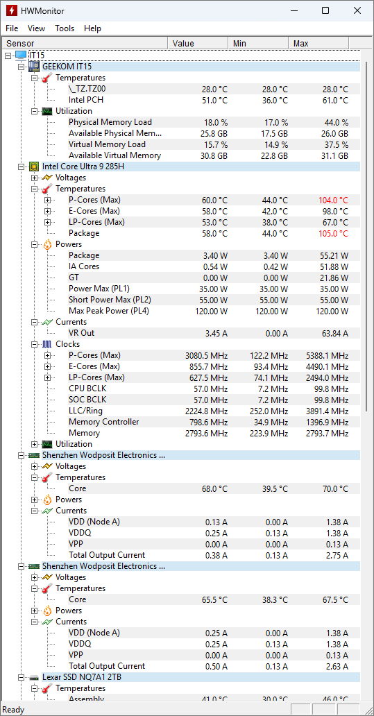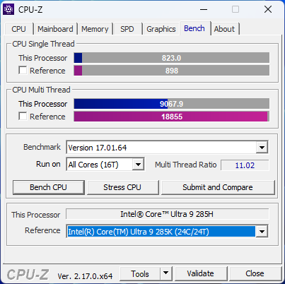Intel Core Ultra 9 285H у меня не было никогда, было только пара моделей из сотой серии и они показали себя неплохо, особенно графика. В данном случае процессор может обрабатывать 16 потоков по формуле: 6 P-ядер + 8 E-ядер + 2 LP E-ядра, т.е. поддержки HT нет, частоты до 5.4 + 4.5 + 2.5 ГГц соответственно, теплопакет по паспорту имеет широченный диапазон 35–115 Вт, впрочем, у AMD он указан обычно уже, но по факту может быть что угодно, на усмотрение вендора. В пару процессору установили 32 ГБ оперативной памяти DDR5, с частотой 5600 МГц, в виде SO-DIMM, т.к. LPDDR5(X) обычно имеет частоту повыше.