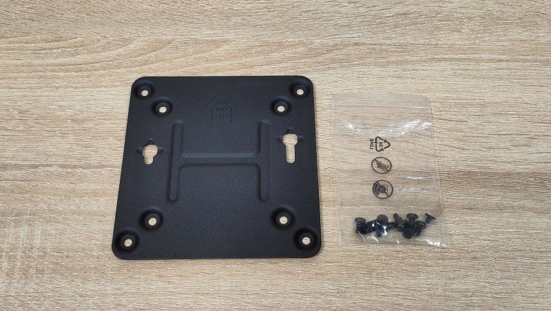 На ней есть схематичное изображение компьютера, по которому можно увидеть только часть передней панели и то без портов. Внутри стандартный набор: мини-ПК, кабель HDMI, сетевой адаптер питания, VESA-кронштейн, руководство пользователя.