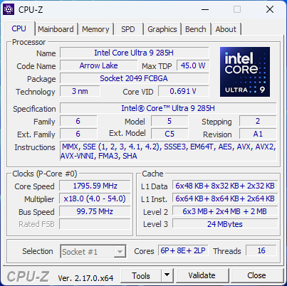 | Процессор | Intel Core Ultra 9 285H: 6 P-ядер + 8 E-ядер + 2 LP E-ядра, частоты до 5.4 + 4.5 + 2.5 ГГц; TDP 35-115 Вт |
