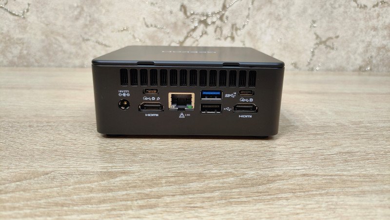Спереди: два USB кнопка питания и миниджек 3.5 мм; слева: забытый многими картовод для SD карт; сзади: 2 USB4 Type-C (левый поддерживает питание, оба поддерживают DP), USB 3.2 Gen2, USB 2.0, 2*HDMI, 2,5 GbLAN, порт питания.