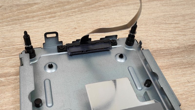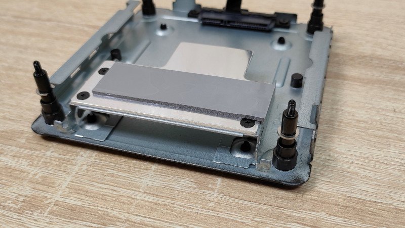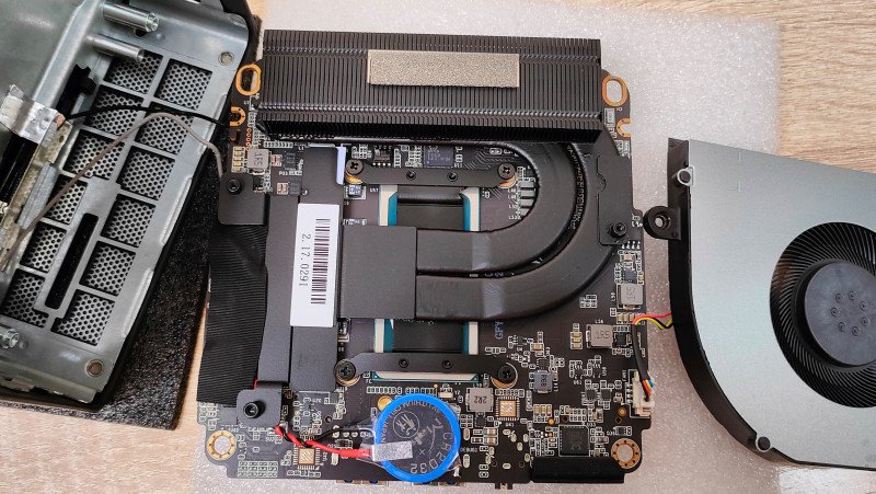 Тут никаких сюрпризов. Первым встречает SATA разъем на поддоне, тут же есть небольшой радиатор-пластина с термопрокладкой для SSD. На плате сразу доступны: модули ОЗУ, накопители, беспроводной модуль (после снятия SSD). Виден дополнительный слот M.2 для укороченного твердотельника формата 2242. Если выкрутить еще два винта, то можно вытащить плату и заняться системой охлаждения, если необходимо. Питание находит в одном контуре системы охлаждения с ЦП, через термопрокладку.